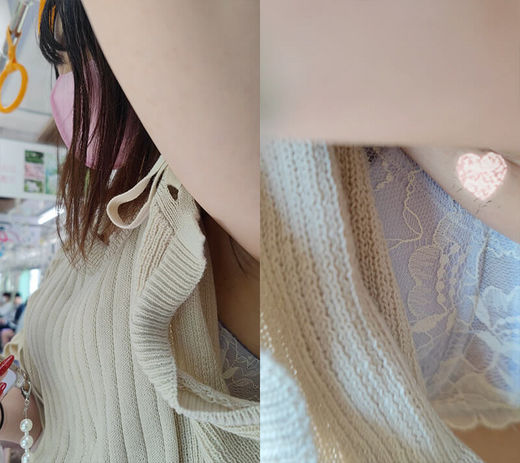 つり革を掴んだり、暑がりなのか襟や袖をパタパタする度に、ワキ汗でしっとり湿ったジョリワキと、薄青のブラが丸見えになってしまっています。