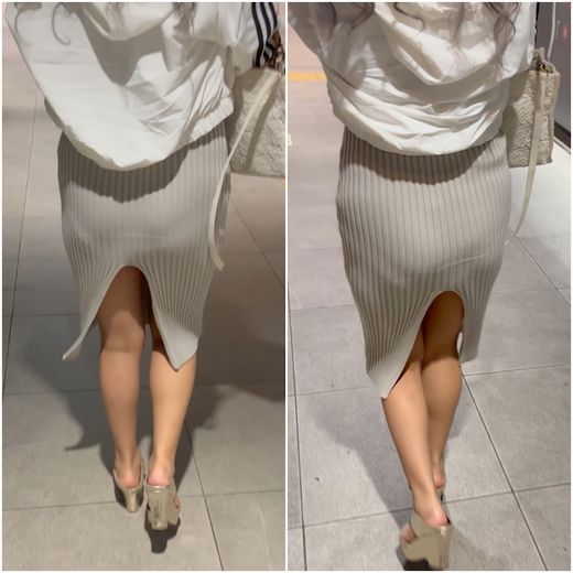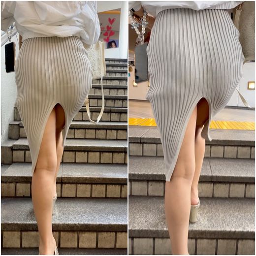 リブニットのタイトワンピース姿でお出かけ。